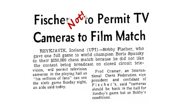 During the day progress was made on the issue of film and television cameras within the hall — Fischer has objected strenuously to them—and it was clear that Chester Fox, who had purchased filming rights, was no longer connected with the match. ([Hence, the Soviet may now proceed with its plan to persecute Robert Fischer with lawsuit for $USD millions, out of its insatiable capitalist appetite for self-glorification, for the next decade. After all, Fischer never agreed to such terms with Chester Fox and his bulky crews of camera men. Rather, it was the Soviet-dominated Icelandic Federation who knowingly agreed to give priority to camera men, when the contract was emphatic: “…under the rules of a world championship tournament, Fischer had a right to demand the removal of the cameras and to refuse to play if they were not removed.” — U.S. Chess Federation Col. Ed Edmondson.])